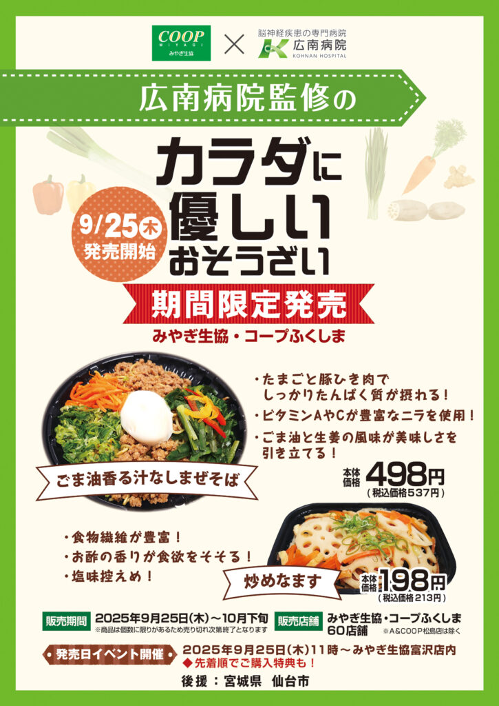 脳卒中は「高齢者」の病気というイメージですが、20・30歳代の患者も珍しくなく、若い年代の人が脳卒中の後遺症で働けなくなり生活が一変してしまう現実を少しでも無くしたい、「おいしくて、カラダに優しいおそうざい」をできるだけ多くの人に、幅広い年齢層の人達に手に取って欲しいという強い思いから生まれたコラボ企画です。9月25日(木)の発売日にはみやぎ生協富沢店内にて発売記念イベントも開催されます。